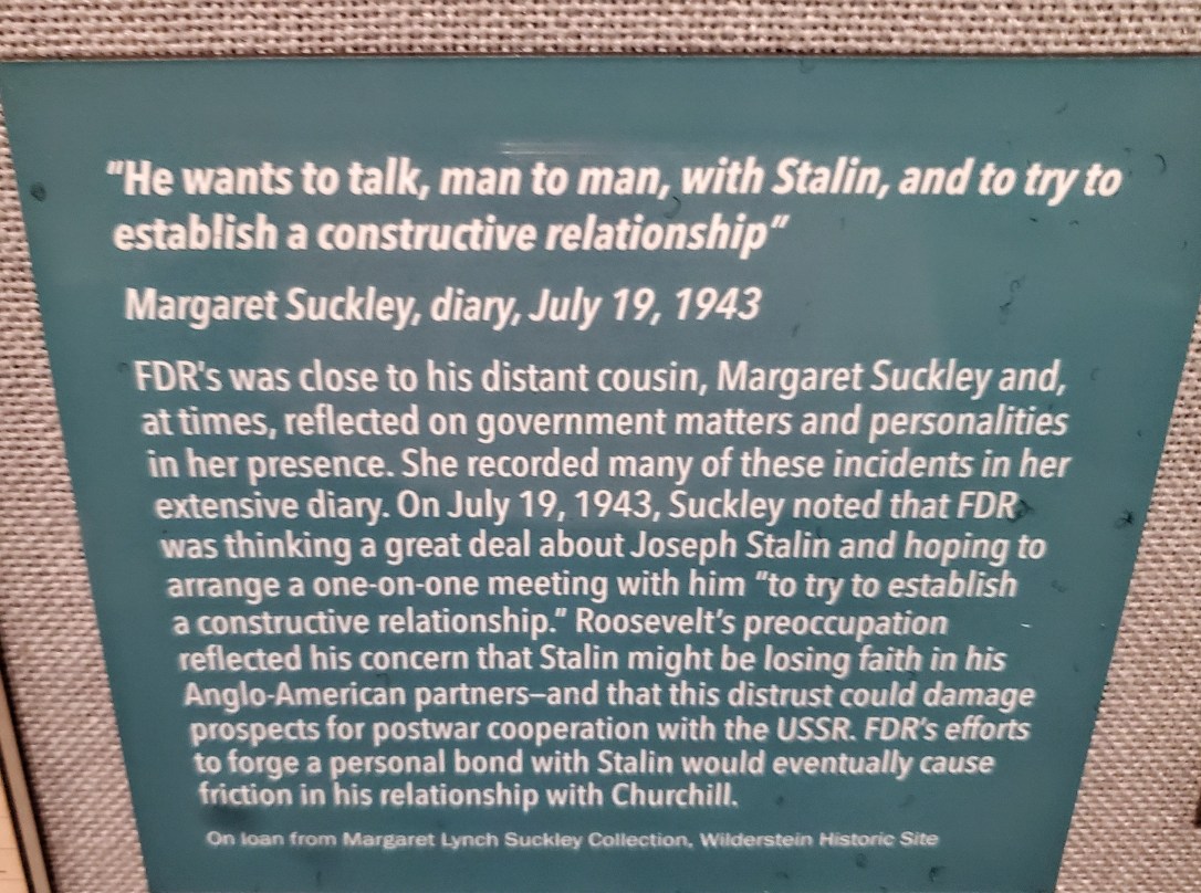 Daisy Suckley, a cousin of FDR, records FDR’s thoughts and concerns about Stalin. Her diary is a treasure and was published as Closest Companion
