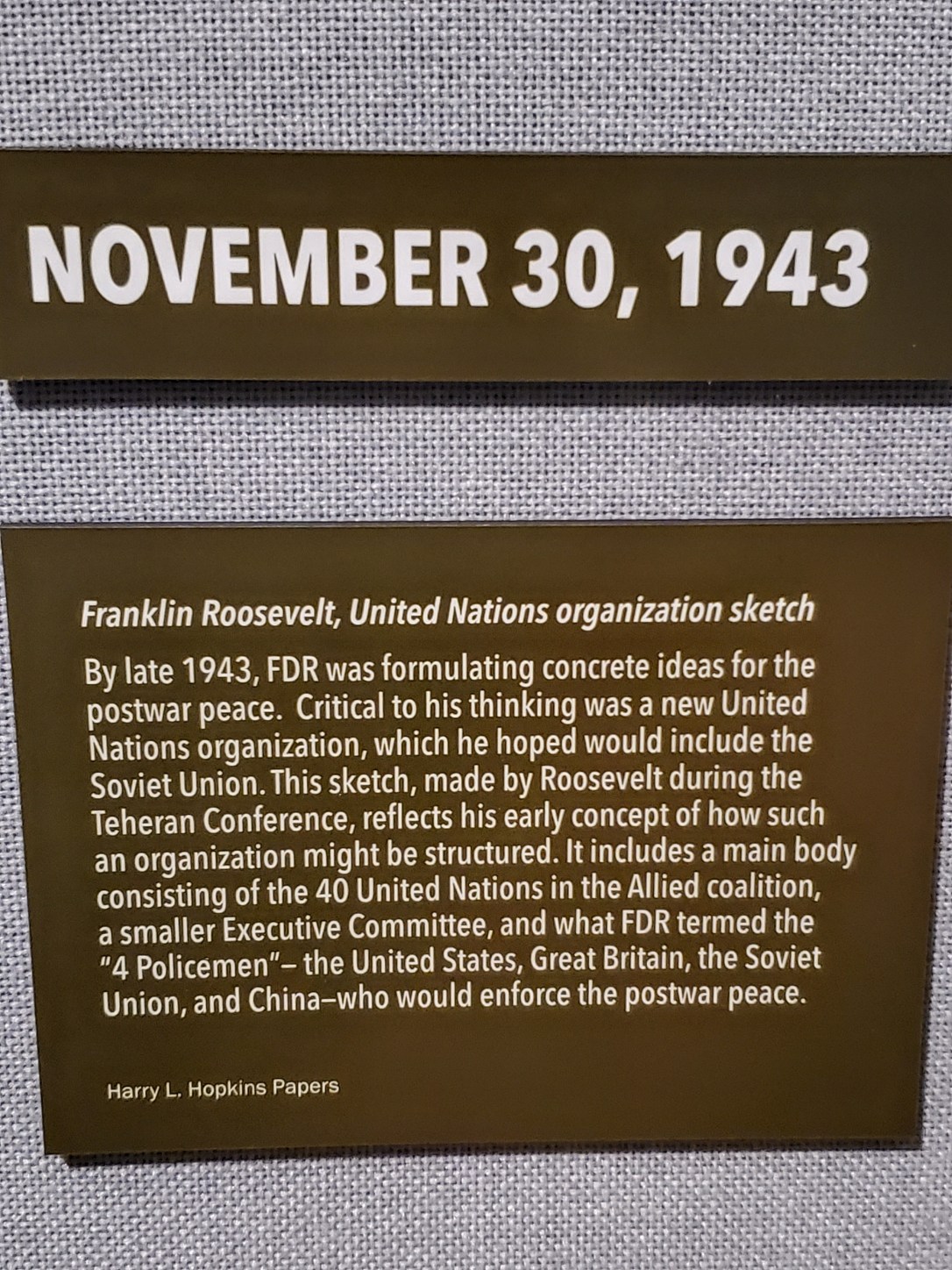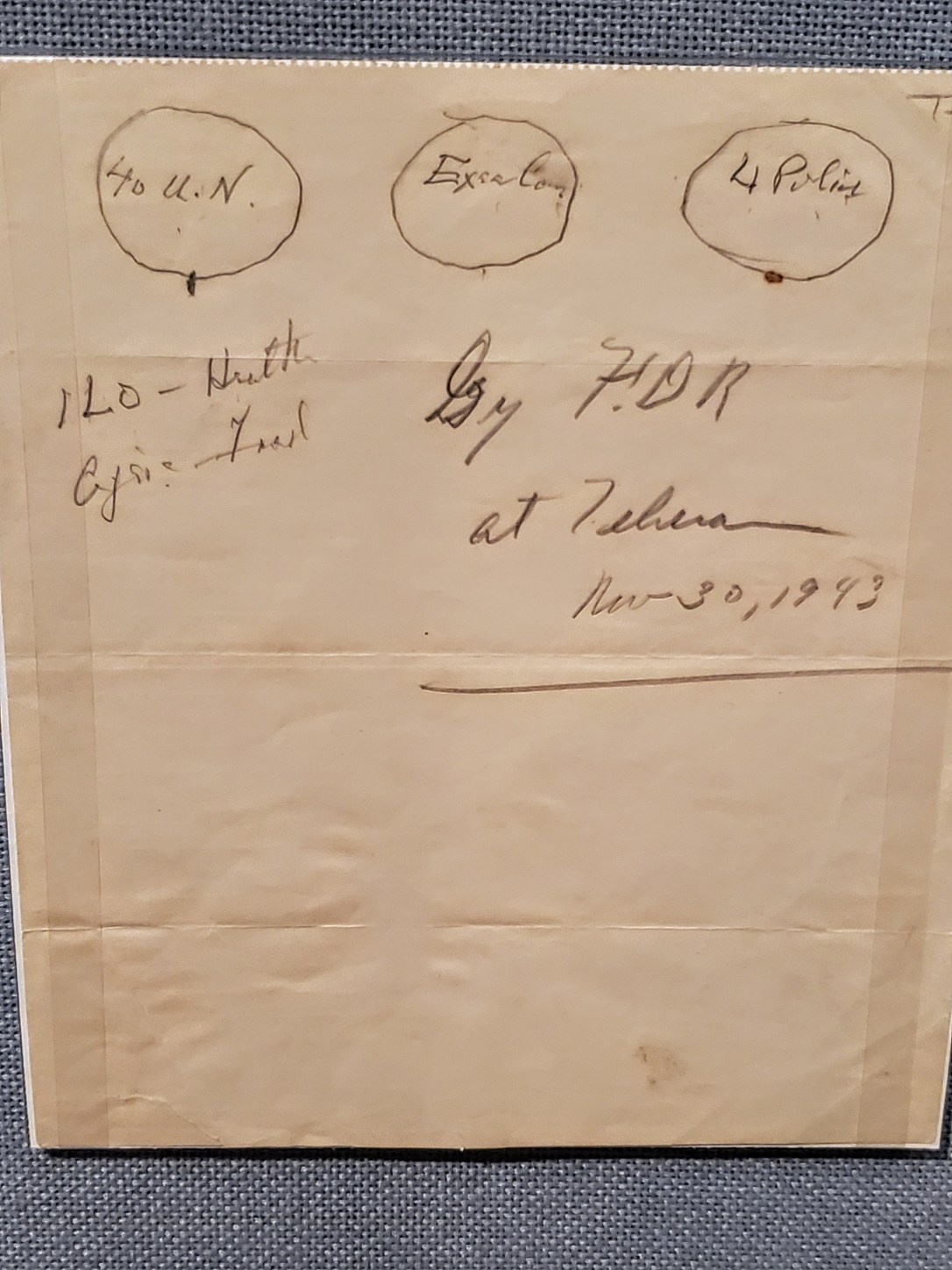 FDR’s sketch creating bodies of the United Nations …the 40 nations of UN, the Executive branch, and 4 policemen ..US, Britian, Russia, China.