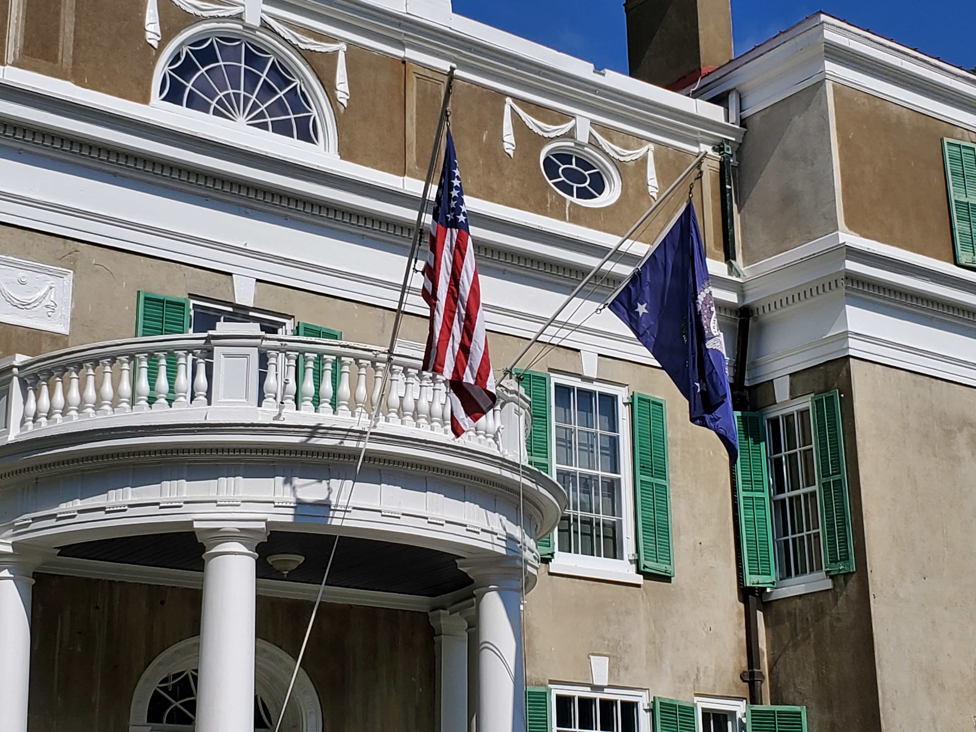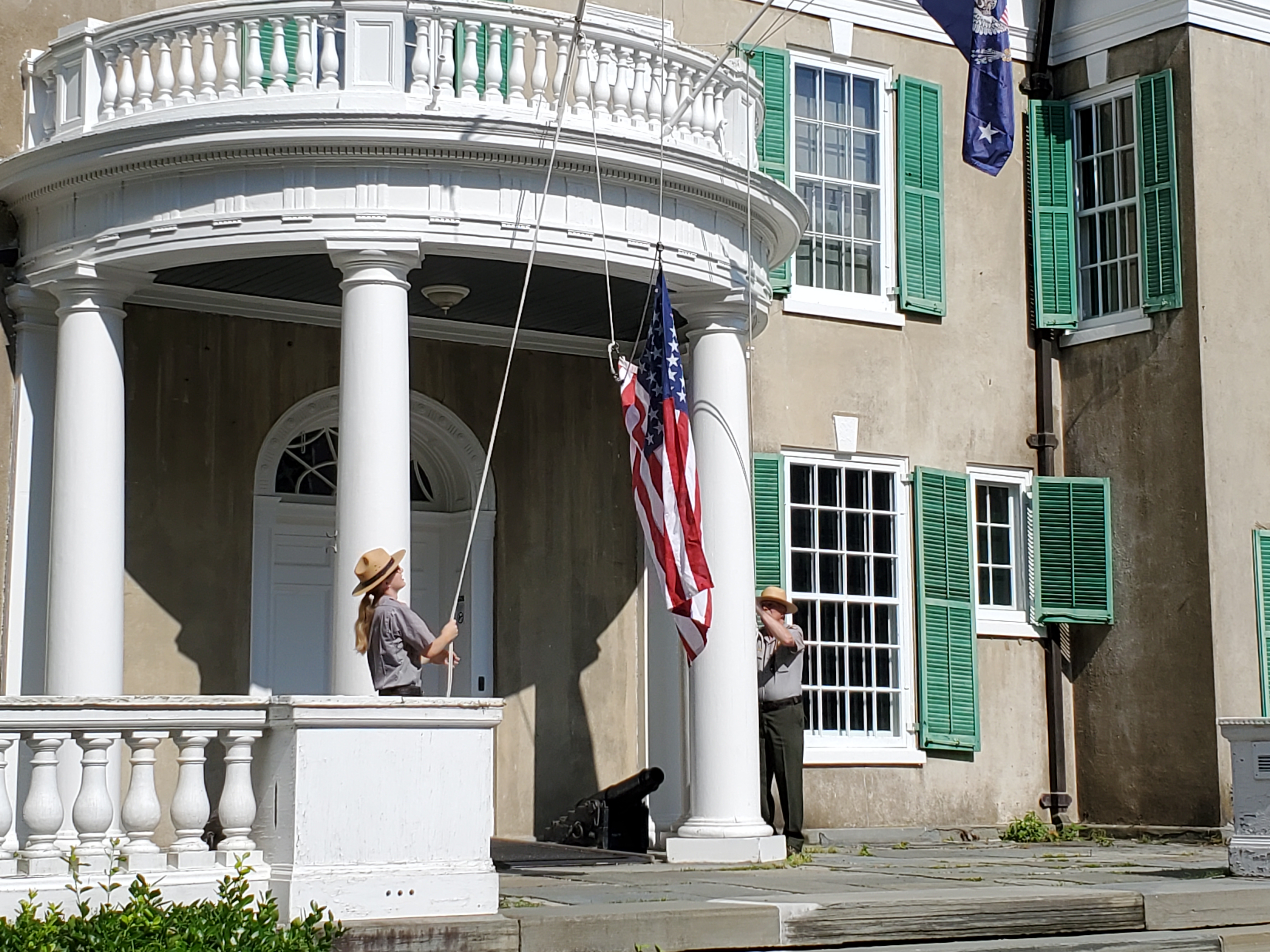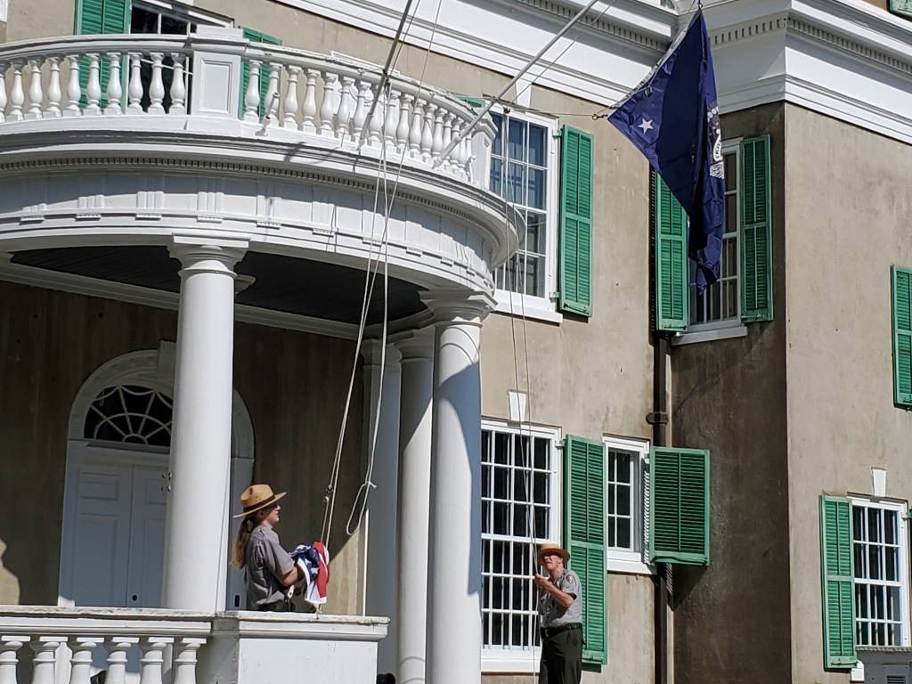 By 10:15 and I had walked the grounds; met with Park Rangers as they raised the flags at Springwood; agreed to do afternoon tours; met with Cliff (Program Director) who said Docent service was now open; agreed to serve as a moderator ( with Cliff) on Saturday at the FDR Reading Festival (15 authors). Whew.